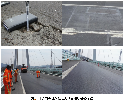 济南黄河三桥是青银高速济南绕城大北环段跨越黄河的一座特大桥,该桥主桥规模在当时同类桥梁中位居世界第二、亚洲第一。原桥面采用环氧沥青混凝土铺装而成,2008年年底通车。2010年东南端桥头桥面铺装出现开裂,泛出锈迹;2011年桥面开裂位置松散和脱落,桥面板裸露,采用进口修复胶进行修复;2012年,修复位置旁又出现大面积脱落和锈蚀,其他部位相继产生了推移、开裂、脱落等损坏。2012年起至今,逐年应用A1型、B型新型高黏沥青进行养护维修,应用至今未产生任何病害,工程成本仅约为原铺装材料的1/3。